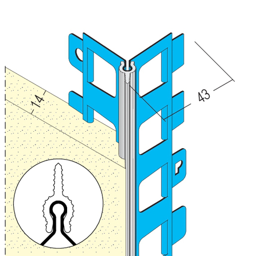 Kantenprofil aus verzinktem Stahl mit PVC-Überzug und schmaler Abzugskante für den Außenputz ab 14 mm. Der PVC-Überzug schützt